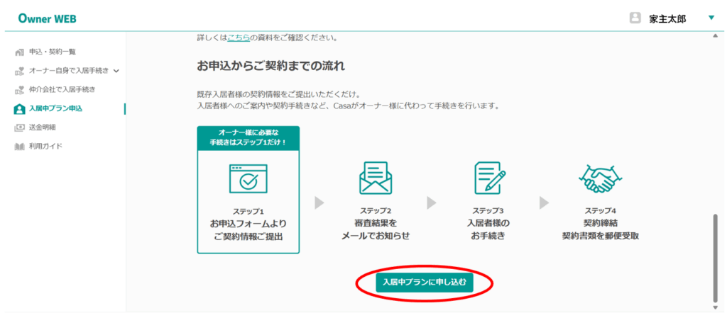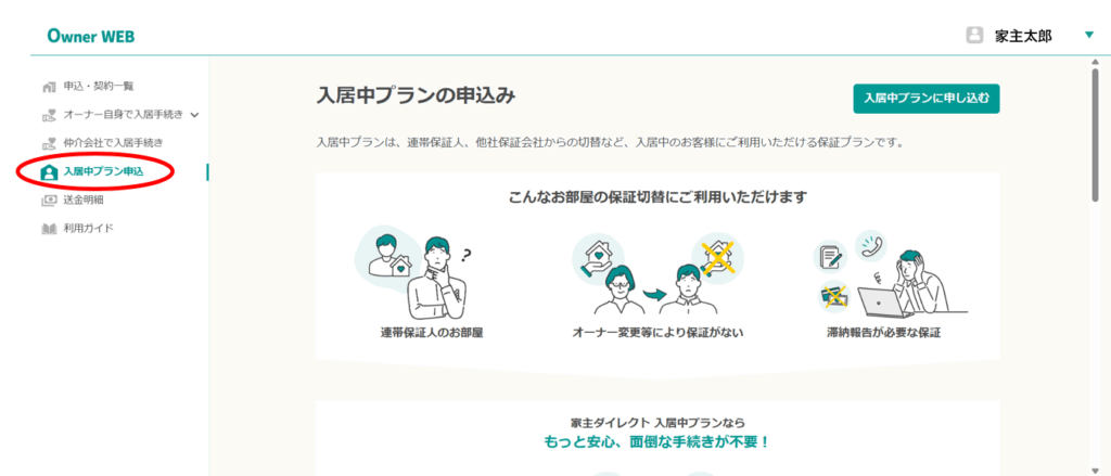 2. Owner WEBのメニューから「入居中プラン申込」を選択